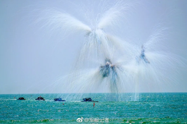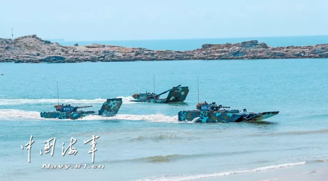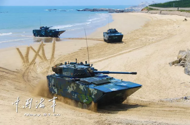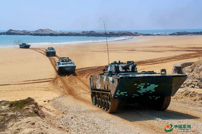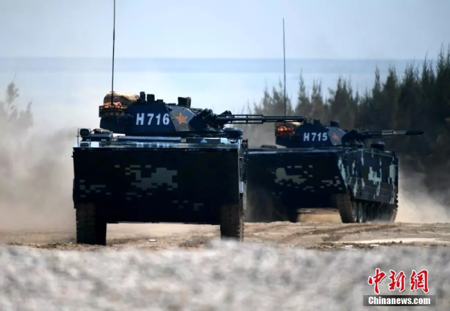 作戰(zhàn)課目演示中,兩棲裝甲車從海上發(fā)起沖擊,泛水抵灘后迅速鎖定目標,大口徑突擊炮、車載機槍連番開火,遠方的靶標紛紛應(yīng)聲而落。