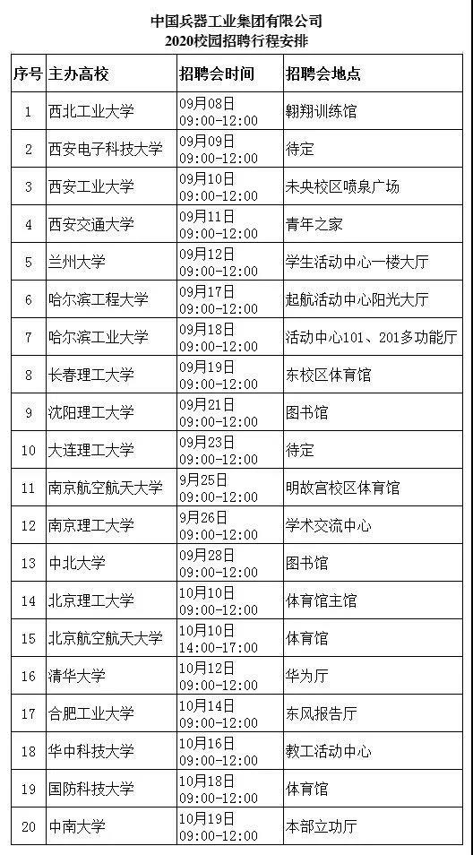 中國兵器工業(yè)集團(tuán) 2020校園招聘火熱來襲 只等你來哦 有夢(mèng)想的青年,請(qǐng)往下面看 讓我們攜手強(qiáng)軍報(bào)國 公司簡(jiǎn)介 我們是我軍機(jī)械化、信息化、智能化裝備發(fā)展的骨干 我們是全軍毀傷打擊的核心支撐 我們是現(xiàn)代化新型陸軍體系作戰(zhàn)能力科研制造的主體 我們是國家“一帶一路”建設(shè)和軍民融合發(fā)展的主力 我們就是 中國兵器工業(yè)集團(tuán) 我們闊步邁進(jìn)世界一流防務(wù)集團(tuán) 資產(chǎn)總額3960億元 世界500強(qiáng)企業(yè)排名140 中國制造業(yè)企業(yè)排名第9 連續(xù)15年獲國資委經(jīng)營業(yè)績(jī)考核A級(jí) 招聘信息 面對(duì)2020年離開校園的你們,我們準(zhǔn)備了 >>職位:1500余個(gè) >>招聘人數(shù):3774人 >>專業(yè)涉及: 武器類 武器系統(tǒng)與發(fā)射工程,彈藥工程與爆炸技術(shù),探測(cè)制導(dǎo)與控制技術(shù)等 機(jī)械類 機(jī)械設(shè)計(jì)制造及其自動(dòng)化,車輛工程,工程力學(xué),機(jī)械電子工程等 電子類 電氣工程及其自動(dòng)化,電子信息工程,通信工程,儀器儀表工程等 材料類 金屬材料工程,材料成型及控制工程,高分子材料與工程,材料科學(xué)與工程等 計(jì)算機(jī)類 計(jì)算機(jī)科學(xué)與技術(shù),計(jì)算機(jī)系統(tǒng)結(jié)構(gòu),計(jì)算機(jī)軟件與理論,網(wǎng)絡(luò)工程等 經(jīng)管類 財(cái)務(wù)管理,工商管理,行政管理,人力資源管理,會(huì)計(jì)學(xué),審計(jì)學(xué)等 其他 環(huán)境與安全類,臨床醫(yī)學(xué),語言類,建筑學(xué),法學(xué),采礦工程,化學(xué)類等 行程安排 中國兵器工業(yè)集團(tuán)2020屆校園招聘會(huì)將在全國12個(gè)城市、20所高校舉辦,招聘會(huì)具體行程見下表: