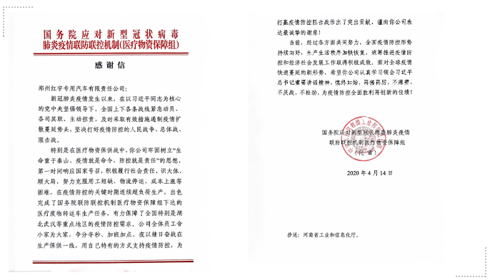 豫西集團(tuán)鄭州紅宇專汽公司收到國務(wù)院應(yīng)對(duì)新型冠狀病毒肺炎疫情聯(lián)防聯(lián)控機(jī)制醫(yī)療物資保障組發(fā)來的感謝信