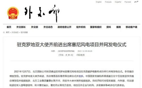 2021年12月7日,中國(guó)兵器工業(yè)集團(tuán)有限公司北方公司所屬北方國(guó)際投資、建設(shè)和運(yùn)營(yíng)的塞尼156MW風(fēng)電項(xiàng)目在克羅地亞首都薩格勒布隆重舉行并網(wǎng)發(fā)電儀式。李克強(qiáng)總理致賀信??肆_地亞總理安德烈·普連科維奇,中國(guó)駐克羅地亞大使齊前進(jìn)出席儀式并致辭。中國(guó)國(guó)家發(fā)展和改革委員會(huì)副主任寧吉喆宣讀李克強(qiáng)總理賀信并視頻致辭,中國(guó)兵器工業(yè)集團(tuán)有限公司董事長(zhǎng)焦開河、克駐華大使米海林視頻致辭。